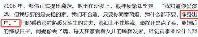 邹伟也找闫妮谈过,但演员这个职业很多时候就是“身不由己”,要不然怎么那么多明星都选择成名之后才结婚生孩子呢。 陪孩子就无法兼顾事业,全身心投入事业又会缺少对孩子以及家人的陪伴,这个问题可以说非常的“致命”。 最终邹伟正式提出了离婚,甚至宁愿净身出户,在刚离婚的那些日子里,闫妮就像丢了魂一样。
